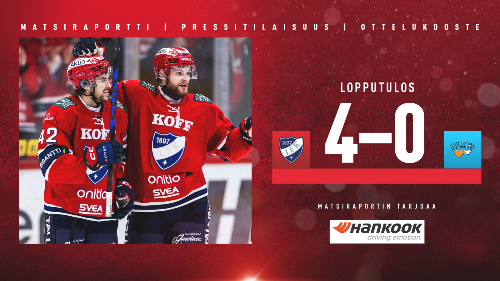 HIFK ja Pelicans iskivät yhteen runkosarjan päätöskierroksella Nordiksella. Kotijoukkue otti vakuuttavan niskalenkin lahtelaisista iskemällä maalin tai kaksi jokaiseen erään. Ruotsalaisvahti Hugo Alnefelt torjui kauden neljännen nollapelinsä ja nollasi Pelicansin.