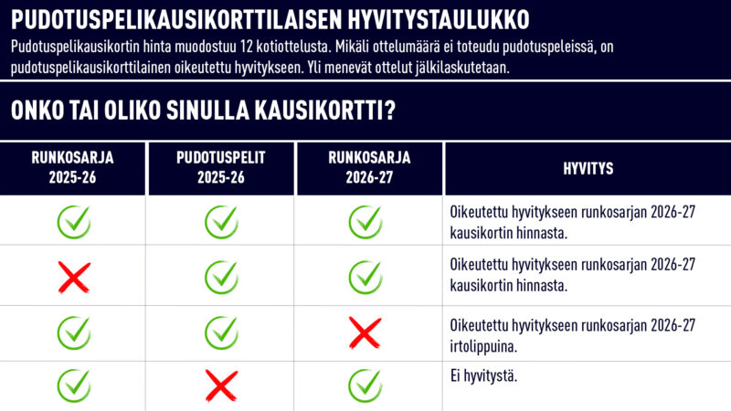 Uudet kortinhaltijat: Kausikortin hinta muodostuu 12 kotiottelusta. Mikäli kaikkia pudotuspeliotteluita ei pelata, hyvitetään pelaamatta jääneet ottelut kauden 2026–2027 kausikortin hinnassa. Mahdollisia pudotuspeleissä jääneitä pelaamattomia otteluita ei hyvitetä uusille kortinhaltijoille, jos ei lunasta kauden 2026–2027 kausikorttia.