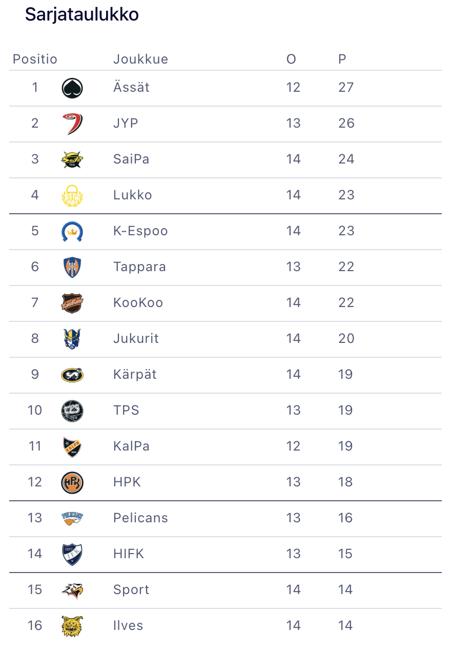 Ässät on voittanut kauden 12 ottelustaan peräti yhdeksän ja hävinnyt vain kerran kotonaan. Joukkue on päästänyt kaikista joukkueista vähiten maaleja (2,00 ottelua kohti).