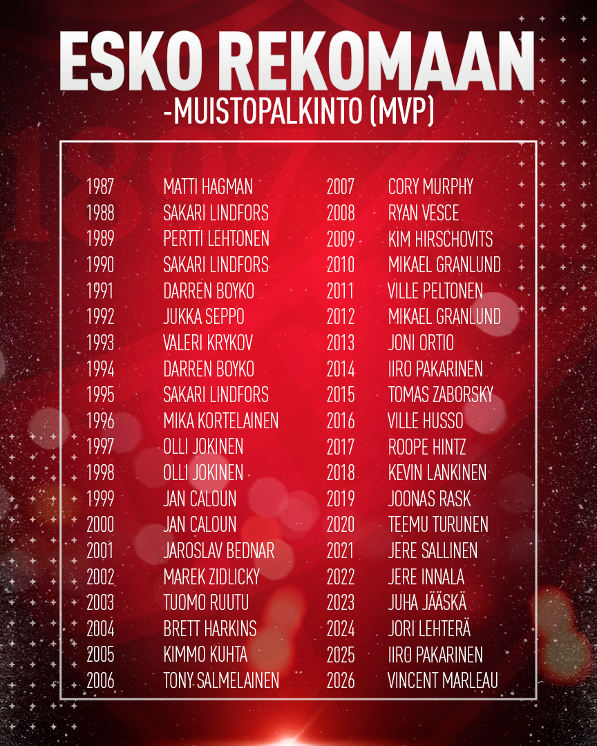 Kanadalaishyökkääjä Vincent Marleaun nimi kaiverretaan Esko Rekomaan muistopalkintoon. Joukkueensa paras pistemies teki päättyneellä kaudella uuden piste-ennätyksensä Liigan runkosarjassa (20+19=39). Marleau oli koko sarjan 13. tehokkain maalintekijä. "Vinny" paransi kokonaisvaltaista peliään kauden aikana ja ihastutti HIFK-faneja maalien lisäksi myös lukuisilla raskailla taklauksillaan.