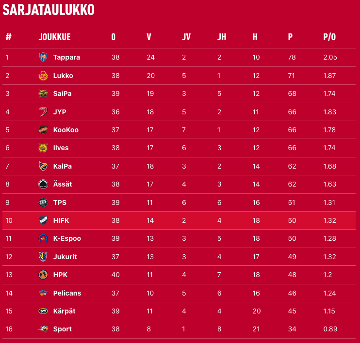 Loukkaantuneet/sairastuneet ja arvio paluusta: Jesse Seppälä (day-to-day), Petrus Palmu (day-to-day), Ossi Sippola (day-to-day), Oliver Larsen (paluu vikolla 4), Hugo Alnefelt (paluu viikolla 4), Panu Mieho (paluu viikolla 5), Eelis Uronen (week-to-week), Anttoni Uronen (paluu viikolla 5), Jakob Ragnarsson (paluu viikolla 8), Bruno Jalasti (paluu helmikuussa), Sebastian Repo (paluu helmikuussa), Valtteri Piironen (paluu maaliskuussa), Juhani Jasu (arvioidaan)